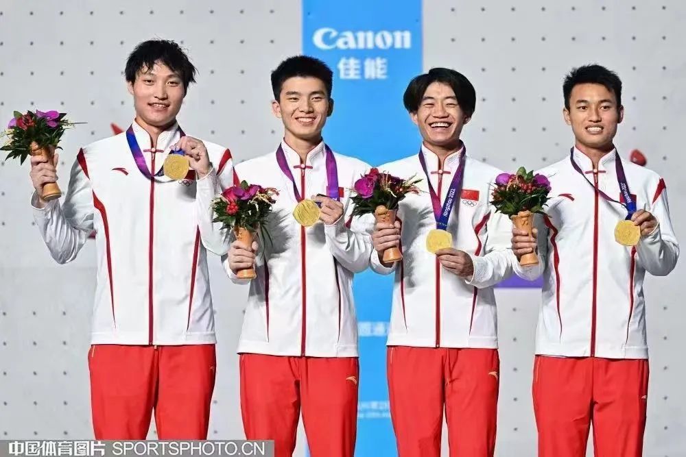 在10月4日晚结束的杭州亚运会攀岩项目男子速度接力决赛中,2021级运动训练专业学生龙金宝(右一)作为中国攀岩男子速度接力队成员摘得亚运会金牌。10月3日,龙金宝获得攀岩男子个人速度赛银牌。